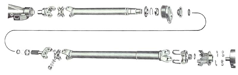 Driveline center support.....(new reproduction) -- -- -- -- 150.00 Driveline center support.......(good, used) 100.00 Bearing.......(good, used) 20.00 Third member .....(air conditioned car on non-air conditioned, -- -- -- -- 195.00 .............non controlled) Third member plug -- -- -- -- 8.00 Rear lower control arm -- -- -- -- 125.00 Illustration of drive shaft If a part doesn't have a price filled in yet, It doesn't mean we don't have that item.