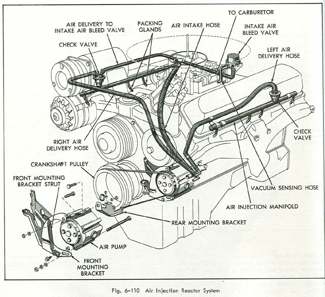 Carburetor.......(Rochester) -- -- -- -- Inquire Choke assembly Carburetor .......(Carter) -- -- 150.00 195.00 -- Choke housing .......(Carter, metal piece) -- -- -- -- 35.00 Choke climatic cover ......(black plastic piece) -- -- -- -- 65.00 Choke tube -- -- -- -- 38.00 Carburetor spacer plate ......(non A.I.R. car) -- -- -- -- 95.00 Carburetor spacer plate .......(A.I.R. car, has extra port) -- -- -- -- 125.00 Fuel filter assembly ......(air conditioned car) -- -- -- -- 45.00 Fuel filter assembly ......(non air conditioned car) -- -- -- -- 45.00 Air cleaner assembly -- 55.00 75.00 95.00 125.00 Fuel tank .....(except commercial chassis) -- -- -- -- Inquire Fuel tank ......(commercial chassis, not available) -- -- -- -- -- Fuel tank float and sending unit .....(air conditioned car -- -- -- -- -- .......$35.00 core charge not included in price) Fuel tank float and sending unit .....(without air -- -- -- -- -- .......conditioning car, $35.00 core charge not included in price) A. I. R. Left air injection manifold w/ check valve -- -- -- -- 125.00 A. I. R. Right air injection manifold w/ dual check valve -- -- -- -- 150.00 A. I. R. Pump -- -- -- -- 95.00 A. I. R. Forward mounting bracket -- -- -- -- 65.00 A. I. R. Forward mounting bracket strut -- -- -- -- 28.00 A. I. R. Rear mounting bracket -- -- -- -- 38.00 Illustration of A.I.R. System Engine heads, block, and manifolds