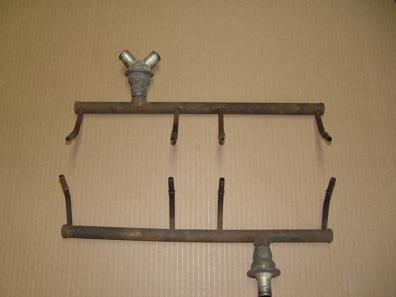 Left exhaust manifold ........nice original -- -- -- -- 175.00 ........(Price does not include $35.00 core charge. Core charge ........is refunded when a remanufacturable core is returned. ........Usable core is not broken in half, or have more than .......two cracks, or have a crack that shows signs of metal .......flaking/corrosion) Left exhaust manifold..........remanufactured -- -- -- -- 195.00 ..........(price includes surfacing, see above for core details) Right exhaust manifold.......nice original -- -- -- -- 195.00 .......(may need surfaced, core charge not included, see ....... left exhaust manifold for core charge details) Right exhaust manifold.......remanufactured 275.00 ........(includes surfacing, requires special machine to surface, ........see above for core details) Head bolt set ........(each side) Cylinder head ........(A.I.R. style) -- -- -- -- 125.00 Intake manifold .......(with cosmetic chipping in webbing) -- -- -- -- 150.00 Intake manifold .......(with cosmetic hair line crack in webbing) -- -- -- -- 175.00 Intake manifold .......(without cosmetic cracks, etc.) -- -- -- -- 295.00 Intake manifold .......(remanufactured) -- -- -- -- 250.00 Heat riser valve ......(mounts on left exhaust manifold, this one -- -- -- -- 95.00 ........will be completely crack free, and nice working) Heat riser valve ......(mounts on left exhaust manifold, this one -- -- -- 65.00 -- .......will have a hair line crack where the butterfly valve rod .......goes through the outer ring, still nice working) 24. Water manifold .......(connects both heads in front -- -- -- -- 125.00 .........of engine houses thermostat, air conditioned or non .........air conditioned car?) 1. Engine front cover assembly -- -- -- -- -- Illustration of front cover assembly, etc. Harmonic balancer -- -- -- -- 65.00 Oil pan -- -- -- 55.00 75.00 Oil pick-up tube screen -- -- -- -- 45.00 Oil pan drain plug .....(minimum $20.00 dollar order) -- -- -- -- 12.00 Engine mount .....(nice used, $15.00 core charge additional) -- -- -- -- 65.00 Dip stick tube .......(3/8" diameter, 14" long) -- -- -- -- ???? Dip stick tube .......(7/16" diameter, 12-3/4" long) -- -- -- -- ???? Dip stick .........(3/8" diameter tube, has tubular cap, 19" long) -- -- -- -- 88.00 Dip stick .........( 7/16" diameter tube, has flat cap, 18" long) -- -- -- -- ???? Radiator ........(nice used) -- -- -- -- 95.00 Flex plate .......(flywheel) -- -- -- -- 195.00 Transmission