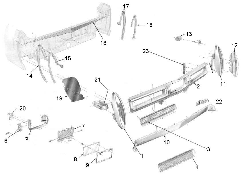 Dash pad ......(mono or stereo, color?) -- -- -- -- 250.00 Dash lower panel .........(under steering column) -- -- -- -- 58.00 Instrument cluster plastic face -- -- -- 75.00 95.00 Instrument cluster printed circuit -- -- -- -- 55.00 Instrument cluster printed face plate -- -- -- 95.00 125.00 Speedometer head -- -- -- -- 65.00 Clock .....(nice working, nice printed face) -- -- -- -- Inquire Clock .....(nice printed face, non-working) -- -- -- -- 38.00 Map light assembly -- -- -- -- 38.00 Gear selector printed face plate -- -- -- -- 48.00 Fuel gauge -- -- -- -- 35.00 Headlight switch -- -- -- -- 55.00 Windshield wiper switch ......(3-speed, with washer) -- -- -- -- 48.00 Dash ashtray pad....(color) -- -- -- -- 38.00 Dash ashtray inserts....(each) -- -- -- -- 22.00 Neutral safety switch ........($15.00 core charge is additional) -- -- -- -- 165.00 Ignition switch .......(without tumblers/key) -- -- -- -- 75.00 Ignition switch ....... NOS ......(without tumblers/key) -- -- -- -- 125.00 Ignition switch tumbler and key set -- -- -- -- 45.00 Steering column .......( tilt-tele, basic col) ....(w/o wheel, -- -- -- -- 250.00 ........levers, neutral switch, or turn signal switch) Steering wheel .....(top level may not be available, color?) -- -- 150.00 200.00 250.00 Steering wheel center pad ......(with good sliver inlay) -- -- -- 75.00 95.00 Featured Item Steering wheel center pad -- -- -- See Pictures ----------> Horn contacts ......(at top of tilt/tele column) -- -- -- -- 45.00 Turn signal switch ........(standard column, hazard light knob -- -- -- -- 195.00 ..........hole square, Delco-Remy) Featured Item