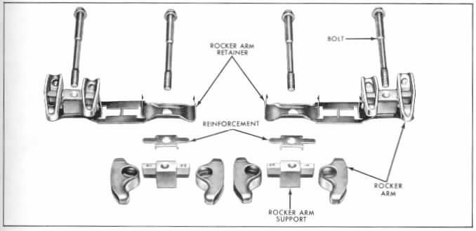 Cylinder head, A.I.R. style ......(without valves, etc.) -- -- -- -- 125.00 Cylinder head, non A.I.R. style .....(without valves, etc.) -- -- -- -- 95.00 .......(add $20.00 each to have cylinder heads magnafluxed) Head bolt set ........(per side) -- -- -- -- 68.00 Rocker arm "T" towers .....(each) -- -- -- -- 28.00 Rocker arms ......(each, which side is open for t-tower?) -- -- -- -- 28.00 Rocker arm retainer....... (each) -- -- -- -- 24.00 Rocker assembly illustration (1967 only)
