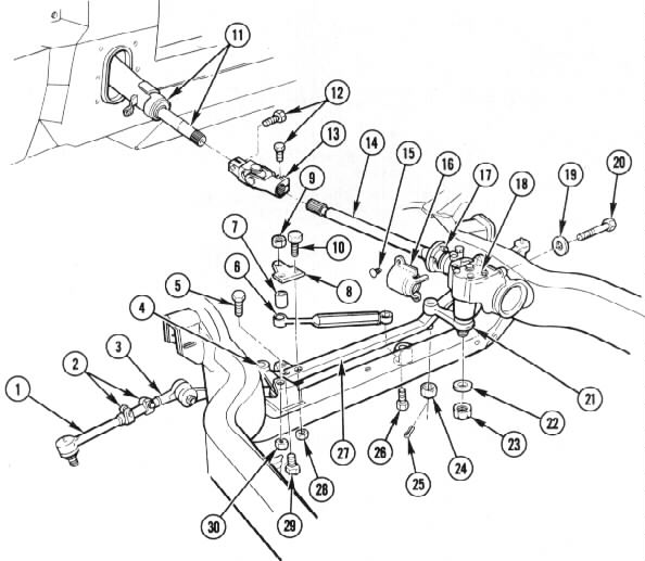 Power steering pump pulley ......(2 groove) -- -- -- -- 38.00 1. Outer tie rod .......(each) -- -- -- -- 25.00 2. Tie rod adjuster .....(each, minimum $20.00 order) -- -- -- -- 12.00 3. Inner tie rod -- -- -- -- 25.00 1-3. Tie rod assembly ........(complete, above three pieces) -- -- -- -- 38.00 4. Idler arm assembly -- -- -- -- 55.00 18. Steering gear box ......(very nice used) -- -- -- -- 95.00 21. Pittman arm -- -- -- -- 45.00 27. Center link -- -- -- -- 55.00 Steering knuckle -- -- -- -- 150.00 Illustration of steering linkages, etc. Suspension, hubs, bearings, etc.
