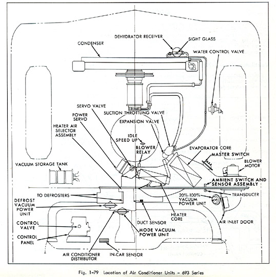 1. Condenser -- -- -- -- $65.00 2. Dehydrator receiver -- -- -- -- 35.00 3. Heater water control valve -- -- -- -- 95.00 4. Compressor with clutch and pulley -- -- -- -- 95.00 5. Discharge low pressure hose -- -- -- -- 38.00 6. Suction high pressure hose -- -- -- -- 45.00 7. Hose and pipe assembly -- -- -- -- 45.00 8. Servo valve -- -- -- -- 45.00 9. Suction throttling valve -- -- -- -- 45.00 10. Power servo .......($35.00 core charge not included) -- -- -- -- 125.00 11. Expansion valve -- -- -- -- 100.00 12. Master switch -- -- -- -- 55.00 13. Blower relay -- -- -- -- 35.00 14. Idle speed up ..........(on carburetor) -- -- -- -- 35.00 15. Heater air selector assembly -- -- -- -- 35.00 16. Mode vacuum power unit -- -- -- -- 55.00 17. Evaporator core -- -- -- -- 95.00 18. Blower motor -- -- -- -- 45.00 19. Vacuum storage tank -- -- -- -- 25.00 20. Defrost vacuum power unit -- -- -- -- 45.00 21. Duct sensor -- -- -- -- 30.00 22. Ambient switch and sensor assembly -- -- -- -- 45.00 23. Heater core -- -- -- -- 45.00 24. 20% - 100% vacuum power unit -- -- -- -- 55.00 25. Control panel assembly ......($45.00 core charge not -- -- -- -- 150.00 ........included) 26. In – car sensor -- -- -- -- 25.00 27. Transducer -- -- -- -- 48.00 Illustration of climate control system Twilight sentinel - Auto dimming