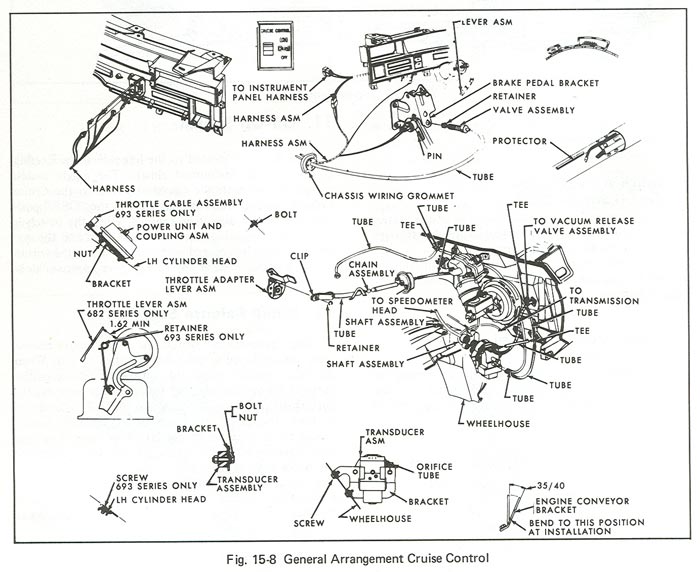 1. Turn signal arm with cruise button and wire ......(state color) -- -- $55.00 3. Vacuum release valve assembly -- -- 22.00 5. Stop light switch -- -- 22.00 8. Dash switch and wire harness -- -- 58.00 9. Dash switch escution -- -- 20.00 10. Cruise transducer ......(main controller) -- -- 125.00 17-19. Control chain -- -- 22.00 21. Speedometer cable ........(transducer to speedometer head) -- -- 32.00 23. Speedometer cable ........(transducer to transmission) -- -- 35.00 24. Power unit .......(servo) -- -- 58.00 Picture of early (top) or late (bottom) style power unit -- Cruise hold terminal resistance wire ........(should read 40 ohms) -- -- 35.00 Illustration for cruise system Ride leveling system