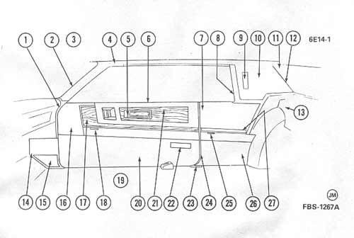 Upper pad -- -- -- -- 150.00 Lower panel ........(armrest portion) -- -- -- -- 150.00 Wood grain with chrome edging trim piece......(Hockey -- -- -- 55.00 75.00 ..........stick shaped, above armrest, 79-83 chrome trimmed, ..........84-85 black trimmed) Courtesy light lens -- -- -- -- 20.00 Left Inside Door Handle -- -- -- 58.00 68.00 Right Inside Door Handle 48.00 58.00 Left door control bezel .........(1979 uses burlwood pattern, -- -- -- -- 35.00 ..........other years are straight grained) Left door window switch .......(2 button) -- -- -- -- 25.00 Door lock switches -- -- -- -- 25.00 Seat switch ......(different styles used, need number of -- -- -- -- 65.00 .........pins on back to match) Illustration of interior side panels Interior side panels and moldings