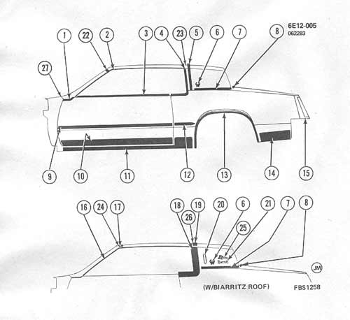 Left door shell .....(without moldings, Biarritz or coupe?) 150.00 175.00 195.00 Right door shell .....(without moldings, Biarritz or coupe?) -- -- 150.00 175.00 195.00 Biarritz door upper molding ......(big die cast piece, likes -- -- 100.00 125.00 150.00 .......to crack directly behind the narrow forward portion, and .......pit in black line) Door outboard window sweep ........(Biarritz, each side) -- -- -- -- 55.00 Door window/quarter window weather strip -- -- -- -- 55.00 Door window motor/regulator assembly ....(parts manual -- -- -- -- 125.00 ......shows only one style, 1979-1985, however we have found ......a second one, one type has six pins on the window switch ......the other style has five pins. The plugs on the motors are ......different) Rear view mirror .........(the following styles of rear view ......mirrors were available, manual remote non heated, ......manual remote heated, electric remote non heated, and ......electric heated. Please indicate which style you have ......when ordering. All mirrors same price.) Left door rear view mirror .......(non thermometer style) -- -- 75.00 95.00 125.00 Left door rear view mirror ......(thermometer style, without -- -- 75.00 95.00 125.00 .........thermometer) Right door rear view mirror -- -- 75.00 95.00 125.00 Rear view mirror thermometer -- -- -- -- 45.00 Door lower molding -- -- -- 35.00 45.00 Illustration of door hardware