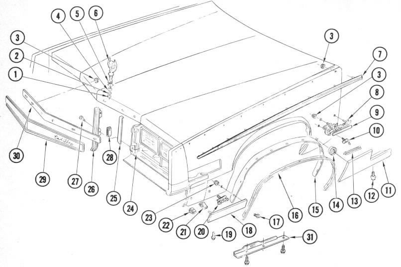 Quarter panel aft/side filler .......(new ABS plastic) -- -- -- -- -- Quarter panel aft/side filler .......(nice original) -- -- -- -- -- Tail light lower filler ........(new ABS plastic) -- -- -- -- -- Tail light lower filler ........(nice original) -- -- -- -- -- Rear center filler/valance (3 pc).......(new ABS plastic) -- -- -- -- -- Rear center filler/valance ........(nice original) -- -- -- -- -- Complete rear filler set (7 pc)........(new ABS plastic) -- -- -- -- 342.00 Illustration of 79-85 Eldo Rear Fillers Price and availability subject to change without notice.